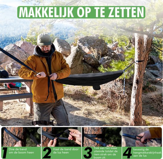 Snelle en Eenvoudige Installatie: Inclusief sterke karabijnhaken en hangmatriemen voor een snelle, gemakkelijke setup zonder de noodzaak voor complexe knopen.