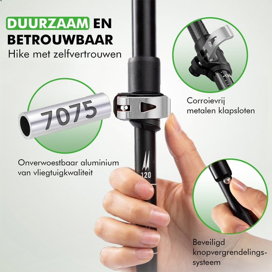 Gemaakt van duurzaam aluminium, combineren deze stokken stevigheid met een laag gewicht. De ergonomische handgrepen en verstelbare lengte zorgen voor maximaal comfort tijdens lange wandelingen, terwijl de antislip rubberen doppen zorgen voor grip op elke ondergrond.
