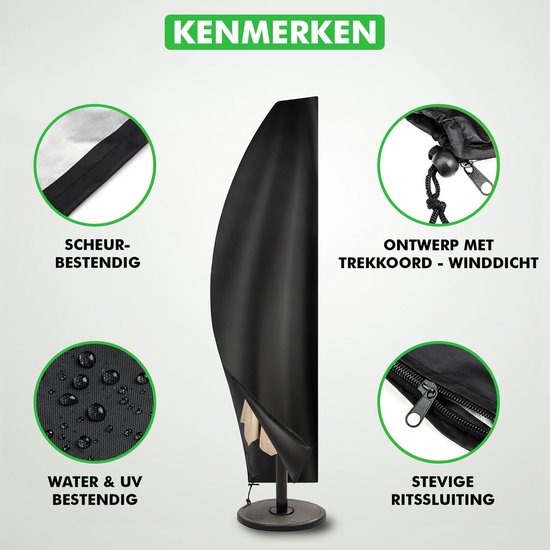 Dankzij de UV-bestendige coating verkleurt of veroudert het materiaal niet snel, terwijl de ritssluiting en het trekkoord zorgen voor een stevige pasvorm rondom de parasol. De hoes is eenvoudig aan te brengen en te verwijderen, zelfs bij hoge parasols, dankzij de bijgeleverde stokverlenging.