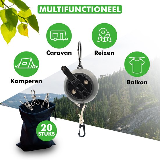 Deze praktische reiswaslijn is uitschuifbaar tot wel 3,5 meter, en dankzij de dubbele gedraaide kabel kun je je kleding eenvoudig tussen de strengen klemmen. Zo blijft alles stevig hangen, zelfs bij wind. Perfect voor op de camping, in hotels, op balkon of tijdens backpackreizen.