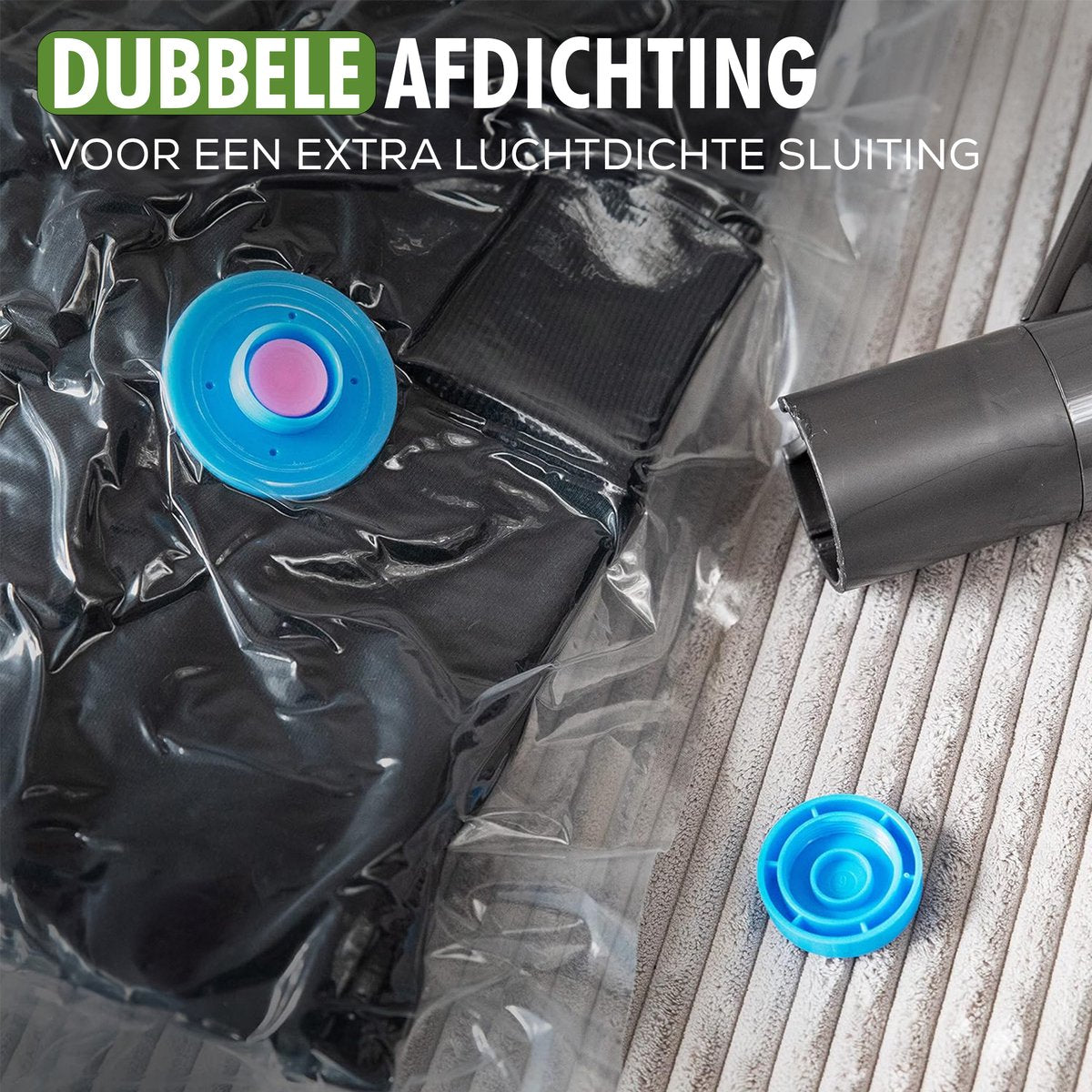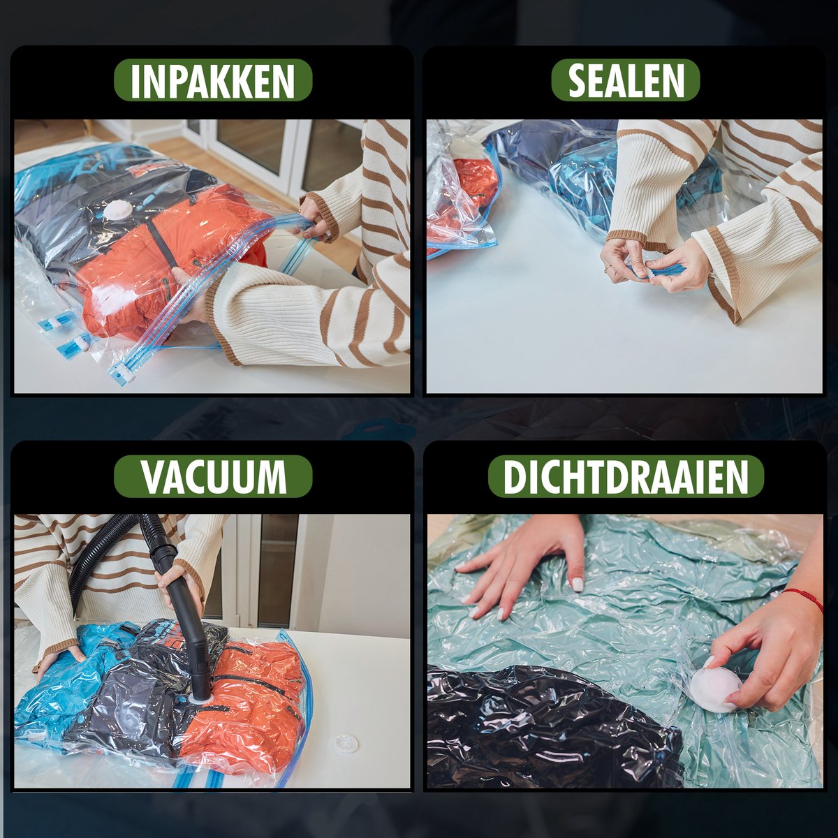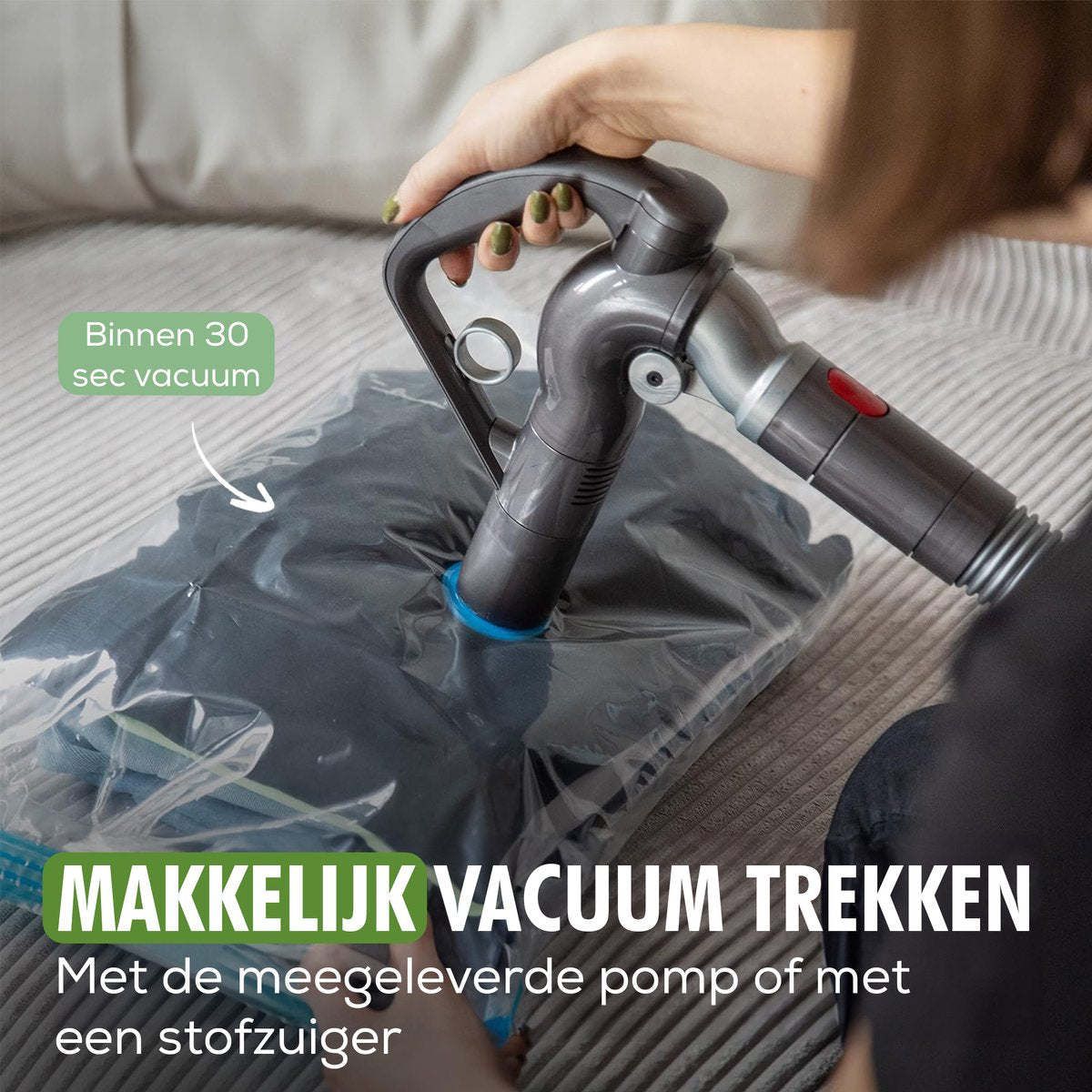Het gebruik van onze vacumeerzakken is snel en gemakkelijk. Plaats simpelweg je dekbed of ander textiel in de zak, ritssluit de zak en laat de meegeleverde vacuümpomp het werk voor je doen. Als je nog sneller wilt werken, kun je zelfs je stofzuiger of elektrische pomp aansluiten op de zak voor nog snellere resultaten.