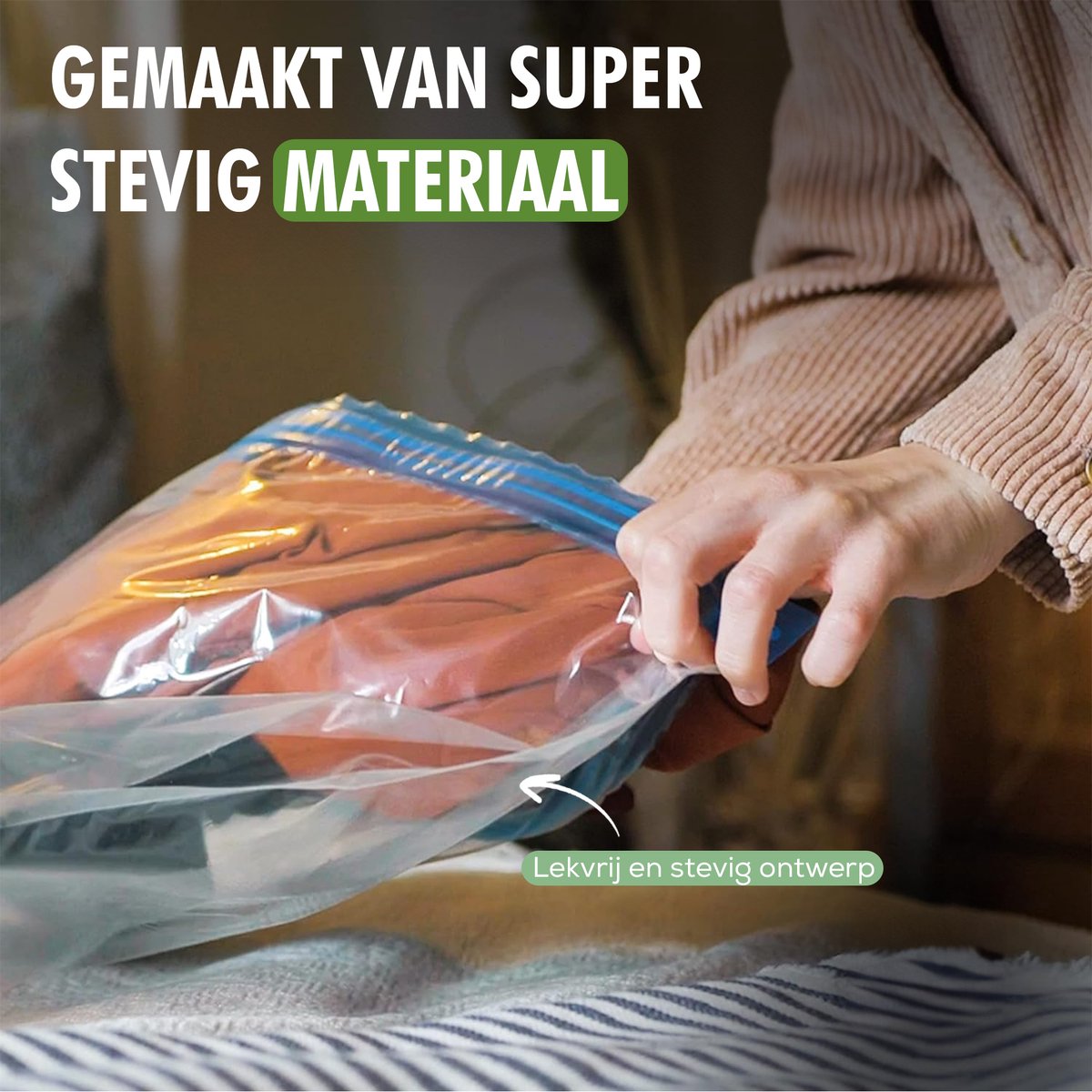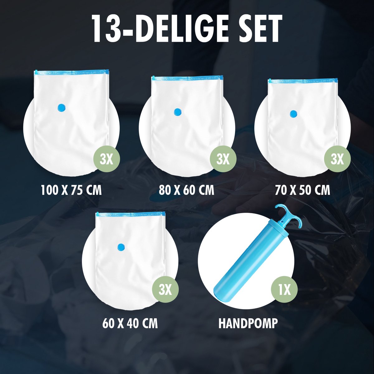 Onze set bevat maar liefst 13 vacumeerzakken in verschillende maten, samen met een handige pomp. Dit geeft je de flexibiliteit om ze te gebruiken voor allerlei opbergbehoeften. Neem de kleinere zakken mee op reis om je bagage georganiseerd te houden of gebruik ze allemaal om je kast netjes en overzichtelijk te houden.