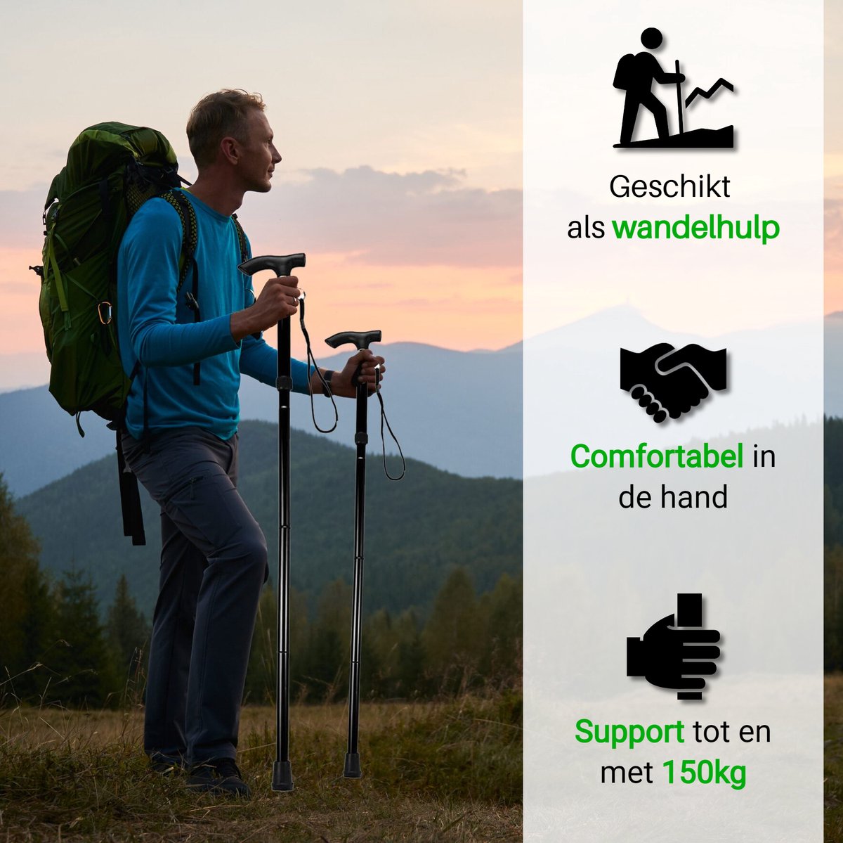 Ergonomische Handgreep De T handgreep is speciaal ontworpen om gebruikers maximale veiligheid en comfort te bieden. De greep is zo vormgegeven dat uw handpalm erin past, alsof het speciaal voor je op maat gemaakt is. De T handgreep zorgt voor een gelijkmatige verdeling van uw gewicht op de stok en daardoor voor extra stabiliteit en comfort.